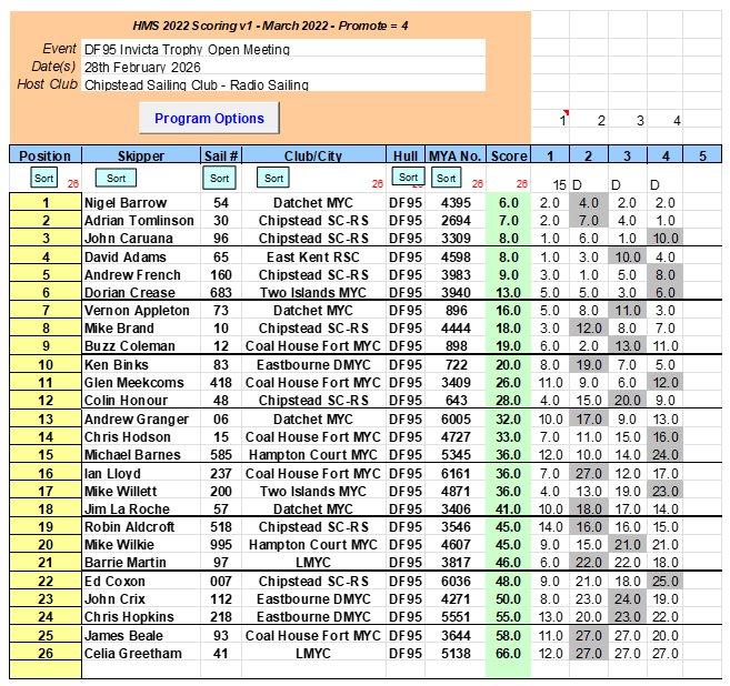 Race-5A finally saw Buzz decide to show his class with a good win from Dorian, Nigel and Ken. David Adams retired with a winch issue.